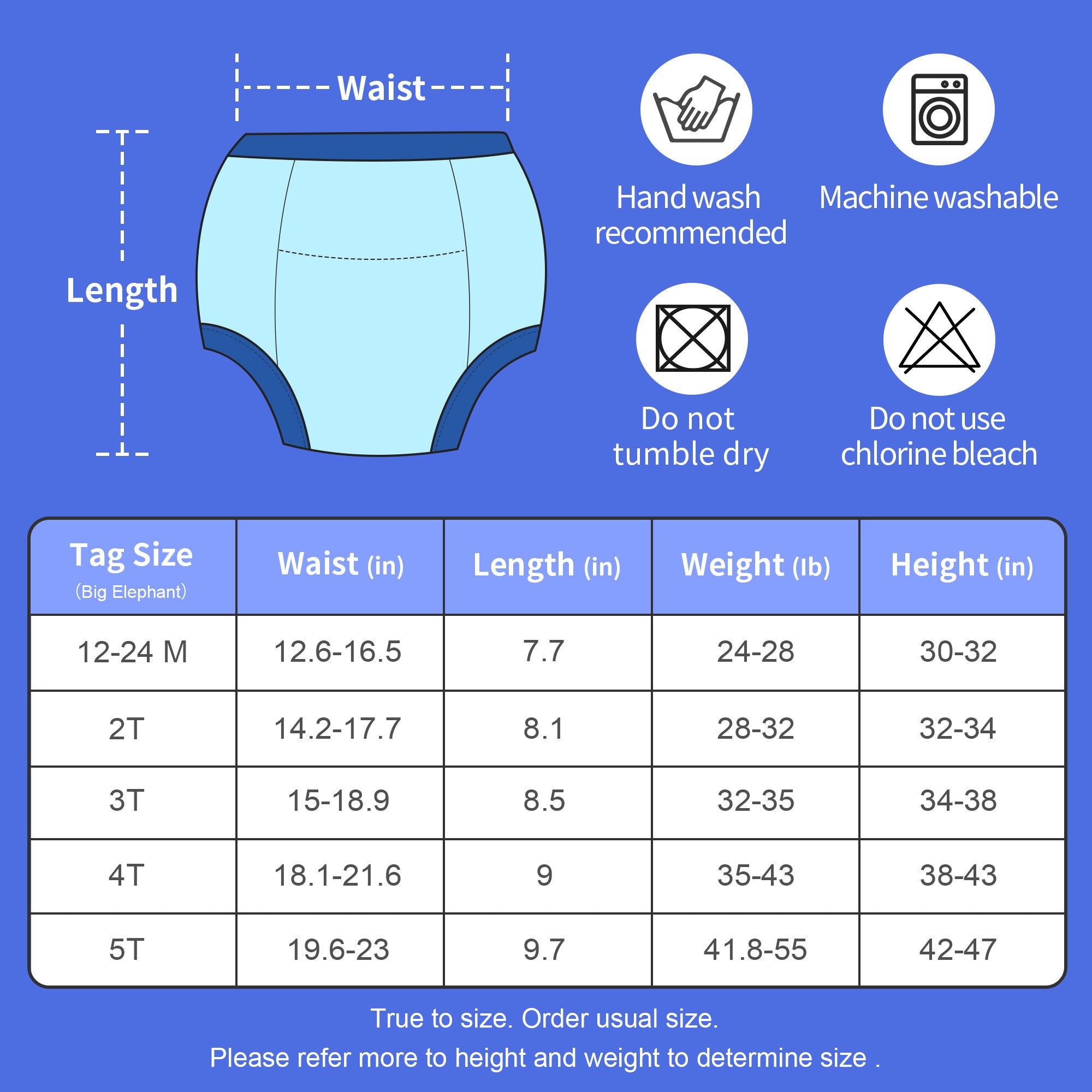 - Absorbent Training Pants: With a multi-Layer crotch design, these training pants offer exceptional urine absorption, reducing leakage risks. BIG ELEPHANT training underpants mark a significant transition from diapers to regular underwear for both girls and boys. For optimal effectiveness, it's advisable to wash these before first use.