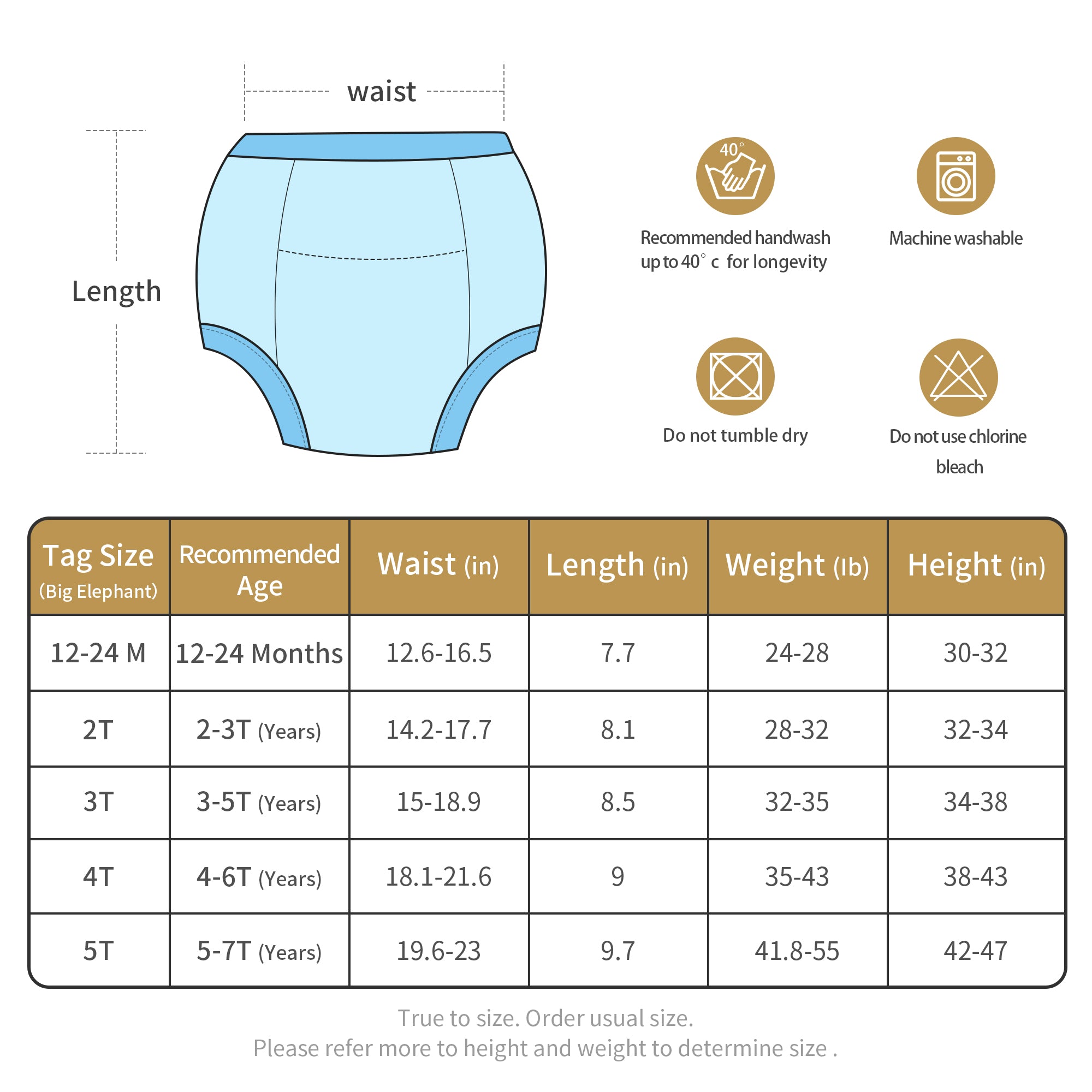 - 【Comfortable and Stretchable】 Big Elephant toilet potty training pants are the ideal transition from diapers to big-kid pants. The learning liner provides a fleeting feeling of wetness to alert the child that they needed to use the potty. The comfortable and stretchy waistband enables active toddlers to pull up unassisted, and the leg holes are made to be less constricting to facilitate walking and playing. There are different patterns & colors to choose for your kids!