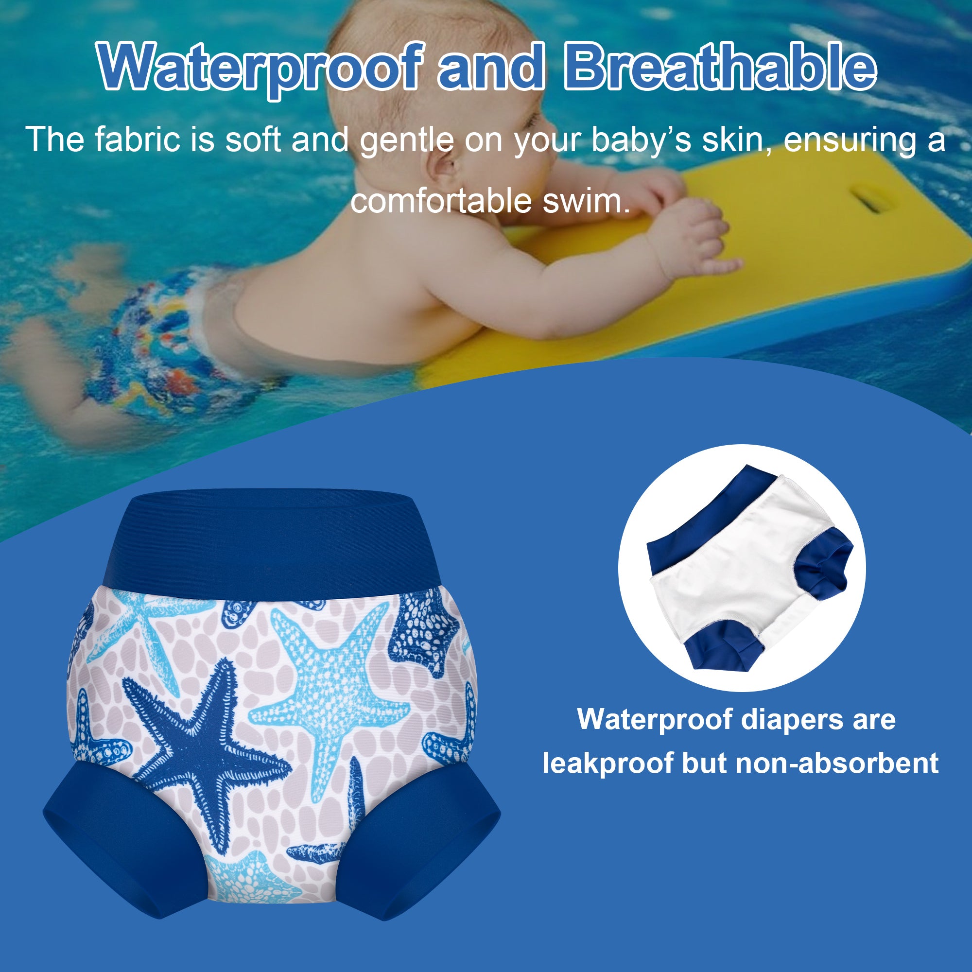 These baby swim diapers feature a two-layer construction. The inner layer is crafted from a soft blend of 92% polyester and 8% spandex, providing a gentle feel against your baby’s delicate skin. The outer waterproof layer is made of a flexible blend of 95% nylon and 5% spandex, offering both durability and comfort for worry-free water play.