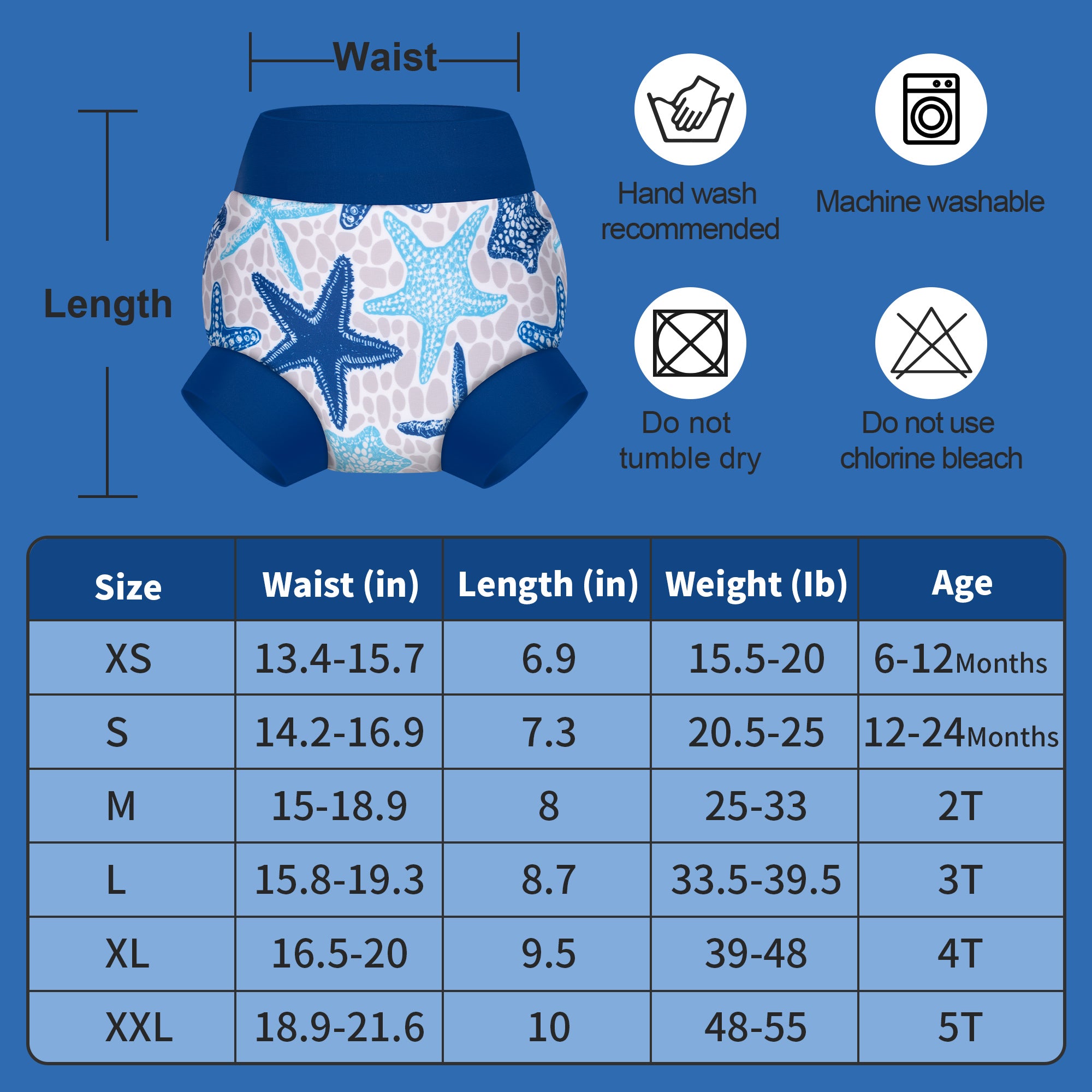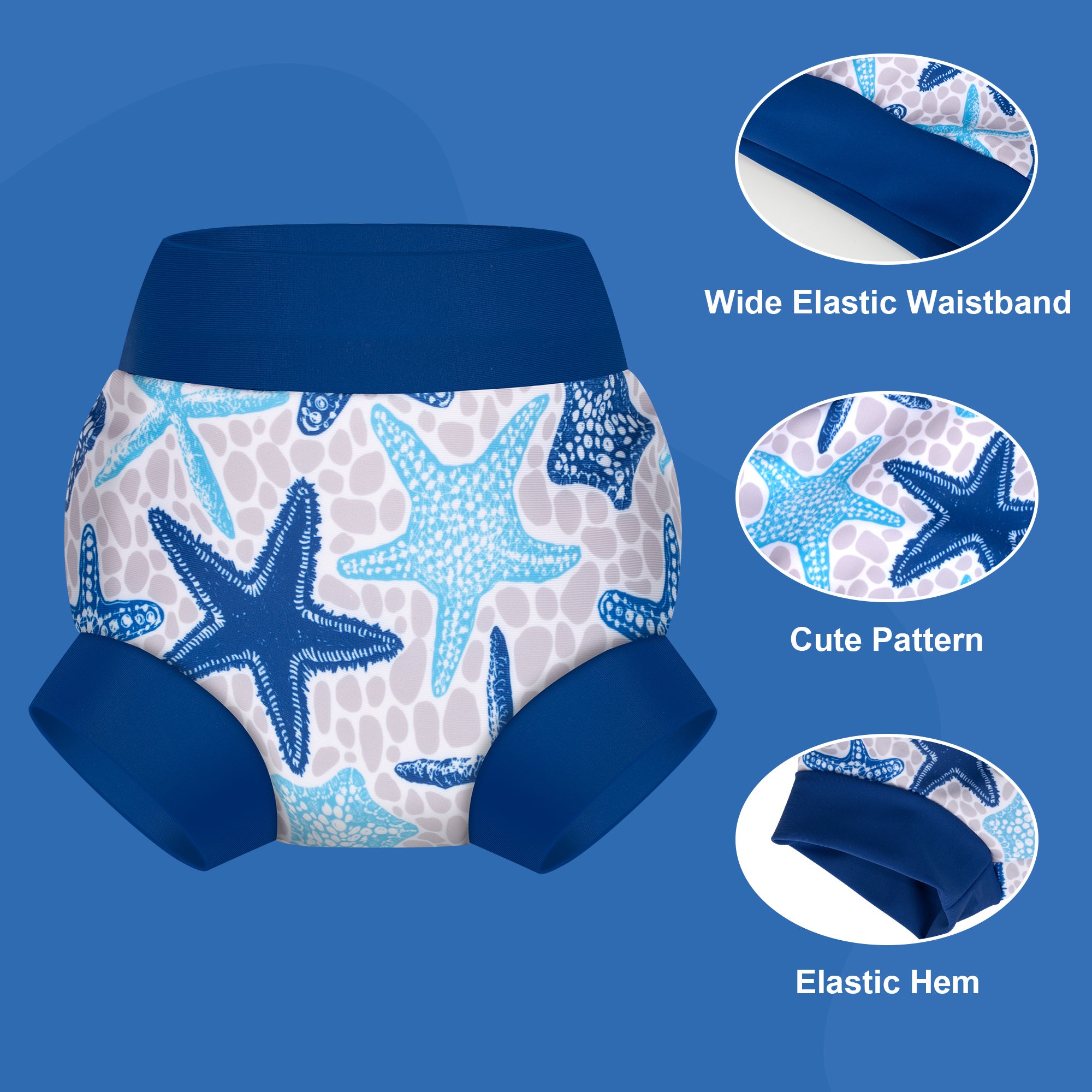 Our adjustable reusable swim diapers come in a range of adorable patterns and designs. These charming styles are sure to delight your baby and add extra fun to swim time. Available in sizes for toddlers aged 6–12 months, 12–24 months, 2 years, and 3 years.