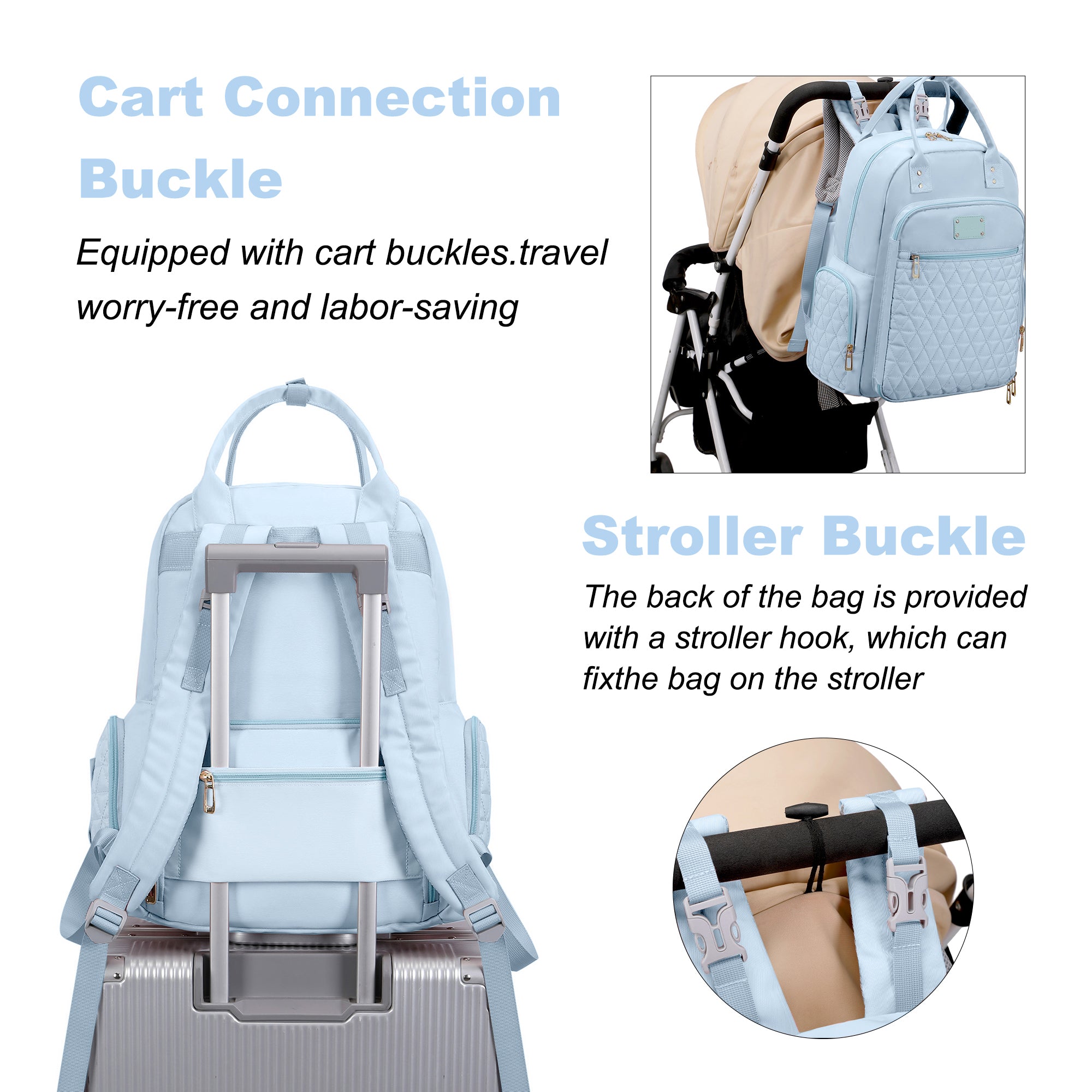 【Hands-Free Carry Options】Carry it however you like—by hand, over the shoulder, or attached to a stroller using the included clips. A built-in luggage strap on the back allows you to secure the bag onto your suitcase, making travel, walks, and outdoor trips effortless and hands-free.
